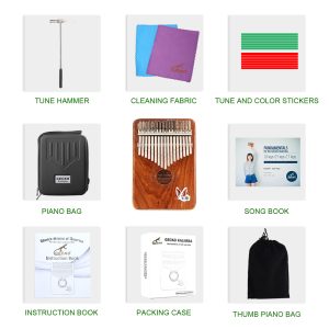 Package includes below: 1 x Kalimba 1 x Instruction Book 1 x Learning Book 1 x Tune Hammer 1 x Tune Stickers 1 x Cleaning Cloth